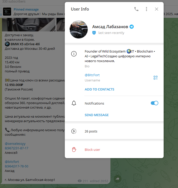 Информации о компании или ИП которые бы занимались данными услугами не было. При этом создатели канала Алексей (@senselessyy) и Амсад (@BitcFort) указывали только номера своих телефонов для связи. Кстати, второй менеджер, вообще теперь пишет о себе как о создателе некой Wild Ecosystem, IT-специалисте, который создает цифровую империю нового поколения: