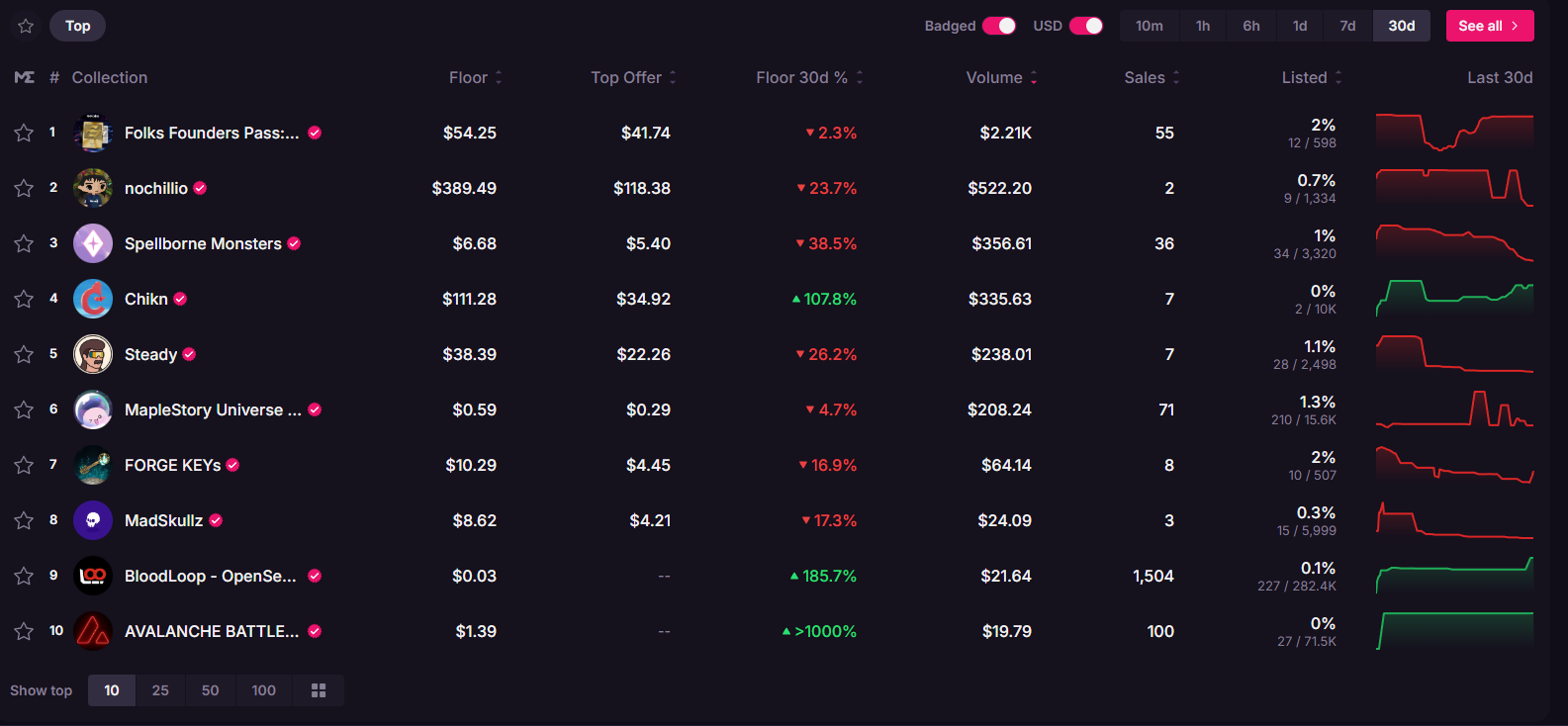 А вот токены Avalanche Battle pass S2 хоть и продаются по цене около 1 доллара, рост их флора за последние 30 дней вышел за рамки 1 тысячи процентов. Правда токен мало кому интересен. За это время было совершено лишь 100 сделок.