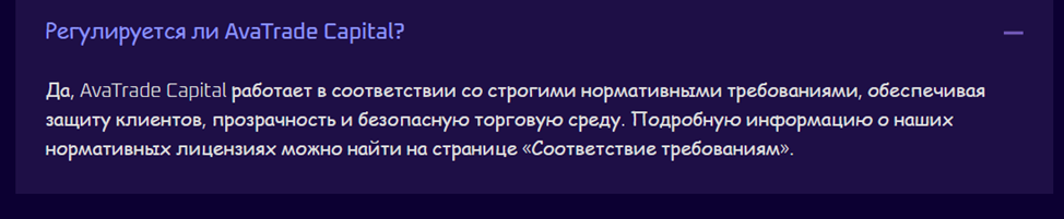 В разделе «Вопросы и Ответы» брокер Avatrade Capital уточняет, что имеет лицензии. Указывает, что подробнее о регуляторах можно почитать на странице «Соответствие требованиям». Такого раздела мы не нашли. На платформе вообще нет никаких документов, что затрудняет использование биржи. Регистрируясь на сайте, клиенты не будут понимать условий и правил использования площадки. К тому же, могут всплыть комиссии, о которых нигде не сказано.