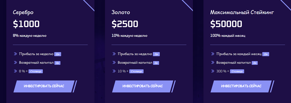 - максимальный стейкинг – депозит от 50000 долларов, 100% каждый месяц;