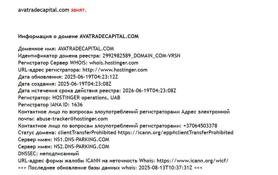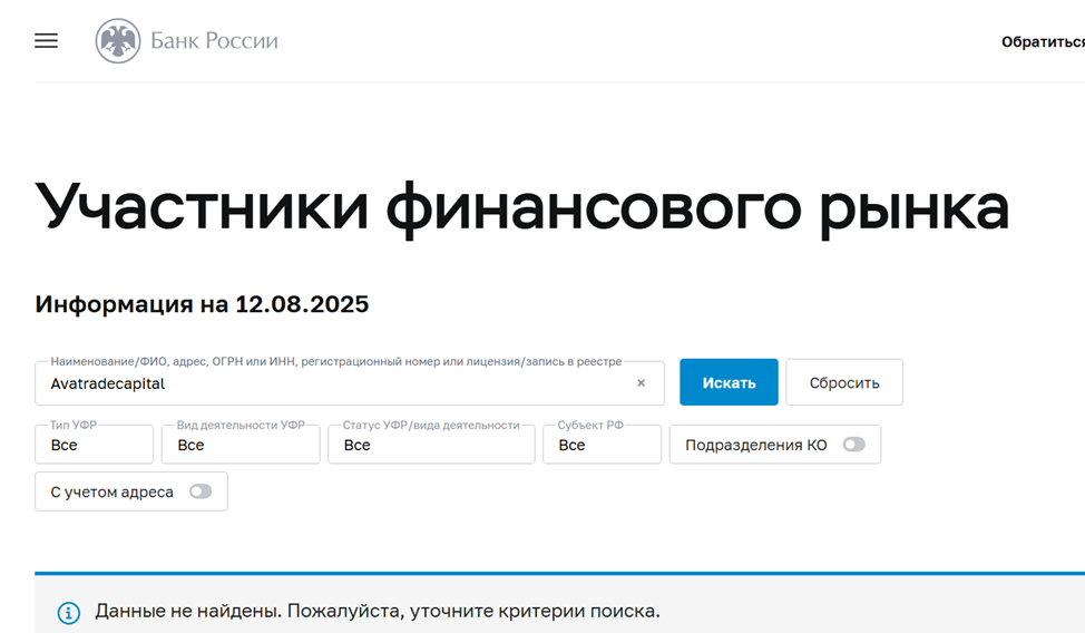 Домен сайта Avatrade Capital зарегистрирован в июне 2025 года. Компания, проработавшая один месяц на криптовалютном рынке, не вызывает доверия. Мы проверили брокера и в реестре Банка РФ. Лицензии от российского регулятора у компании нет.