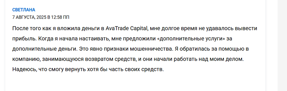В августе появились отзывы о Avatrade Capital Com. Все они негативные. Клиенты жалуются на брокера. Люди столкнулись с проблемой вывода денежных средств. Все запросы игнорировались, поэтому биржу уже начали относить к мошенническим.