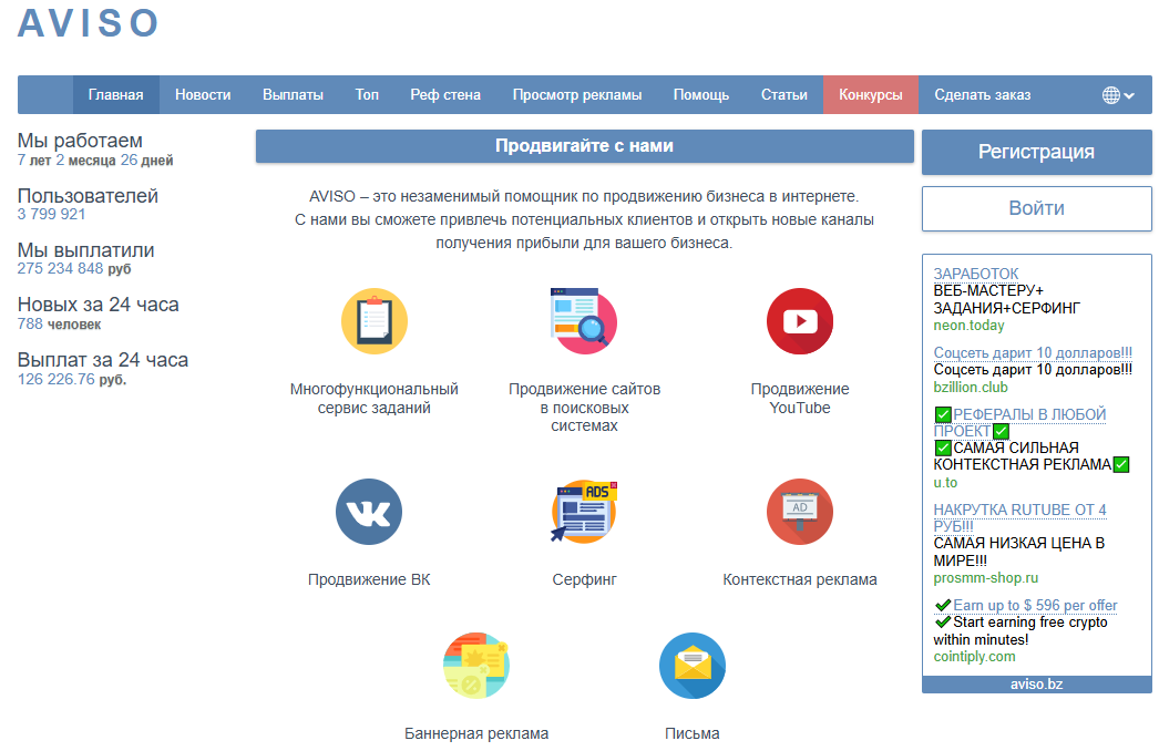 Сервис Aviso bz запустили в 2018 году. Это букс, на котором можно найти много низкооплачиваемых простых заданий. Обычно они сводятся к просмотру видео, переходам по ссылкам, лайкам и подпискам в социальных сетях.