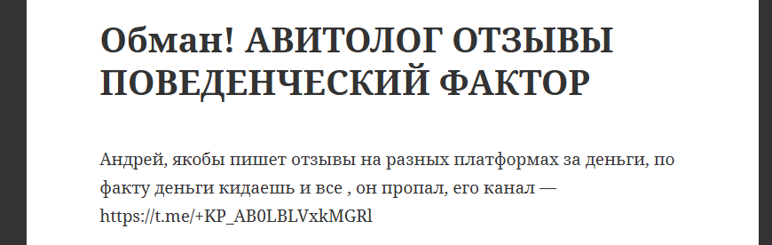 В интернете у Андрея и его телеграмм-проекта “Авитолог отзывы поведенческий фактор” репутация негативная. Его называют мошенником. Жалуются, что после получения денег он не выполняет обещанную работу, перестает отвечать на сообщения. Ниже пример отзыва одного из его клиентов: