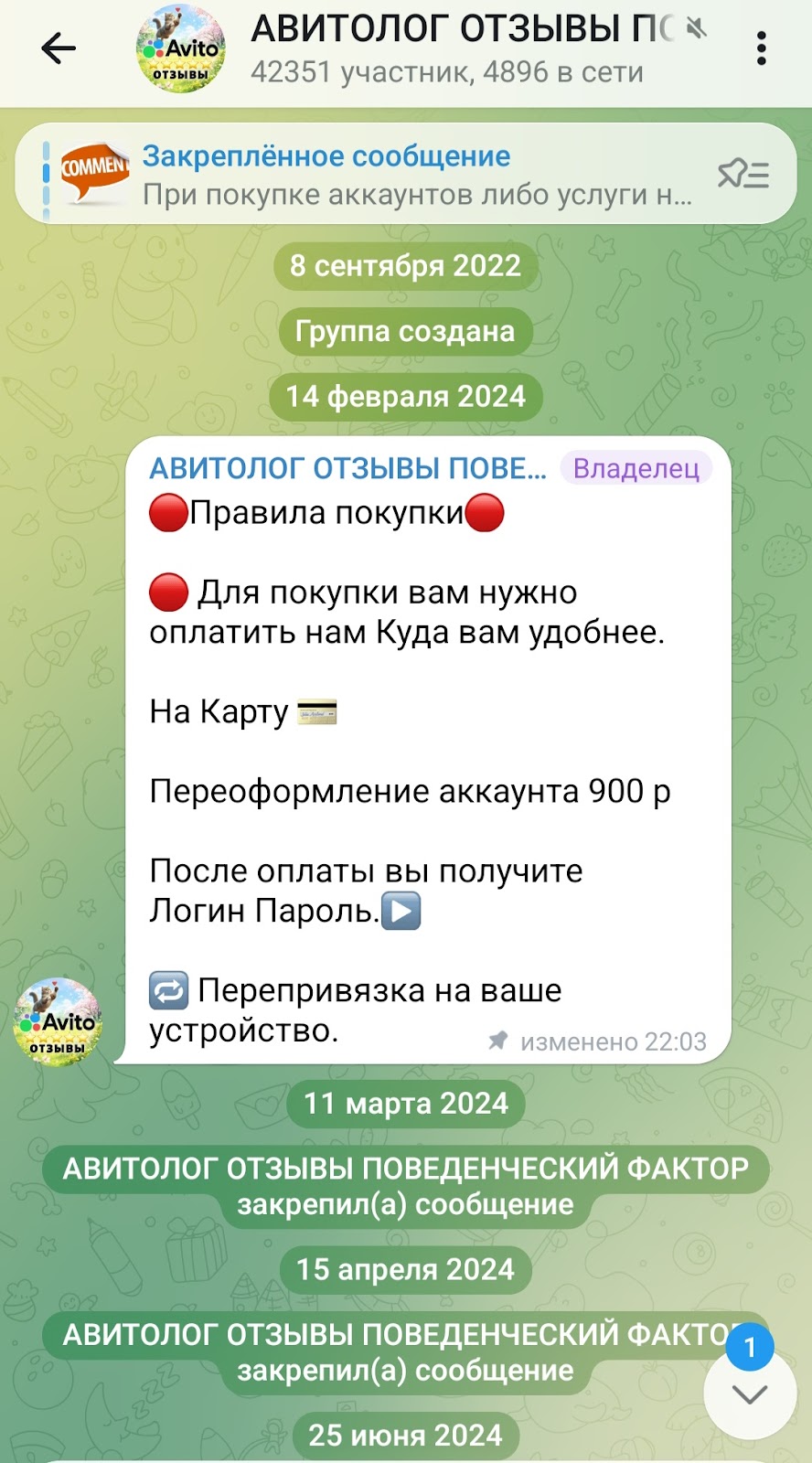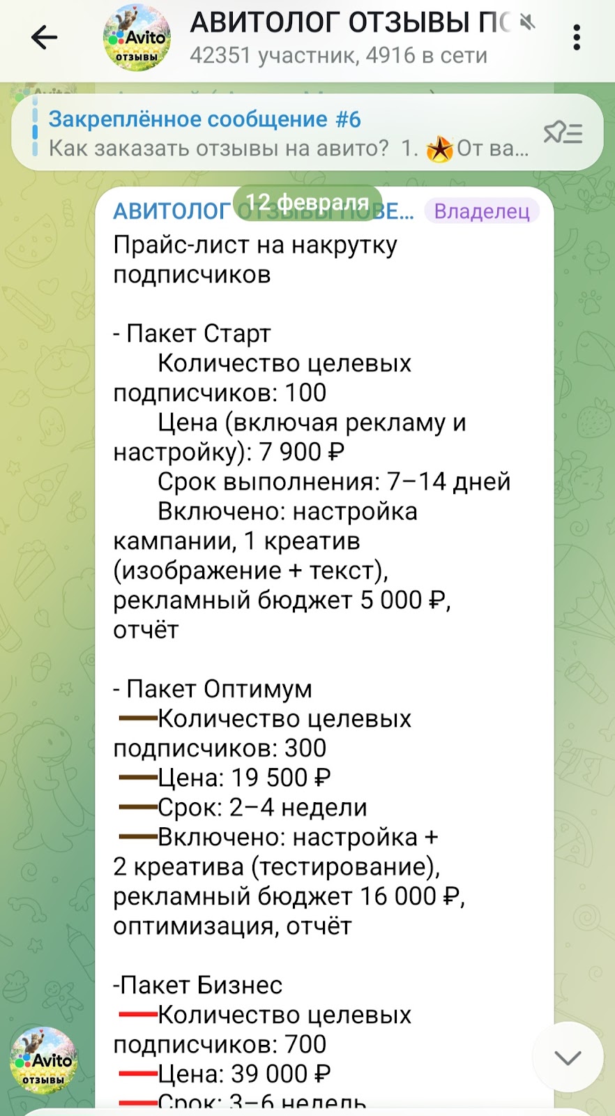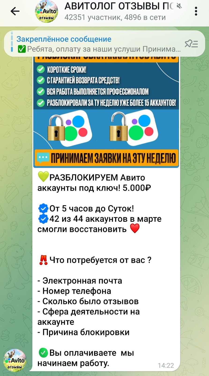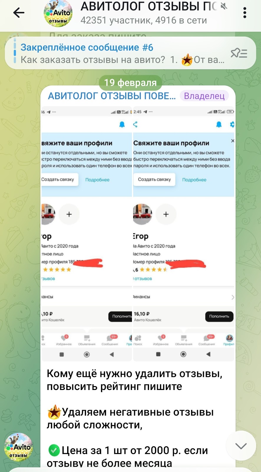Через канал “Авитолог отзывы поведенческий фактор” предлагают написание и удаление отзывов, покупку раскрученных аккаунтов, накрутку подписчиков и другие услуги для повышения рейтинга и раскрутки профиля. Но прежде чем заказывать в нем услугу, учтите следующее: