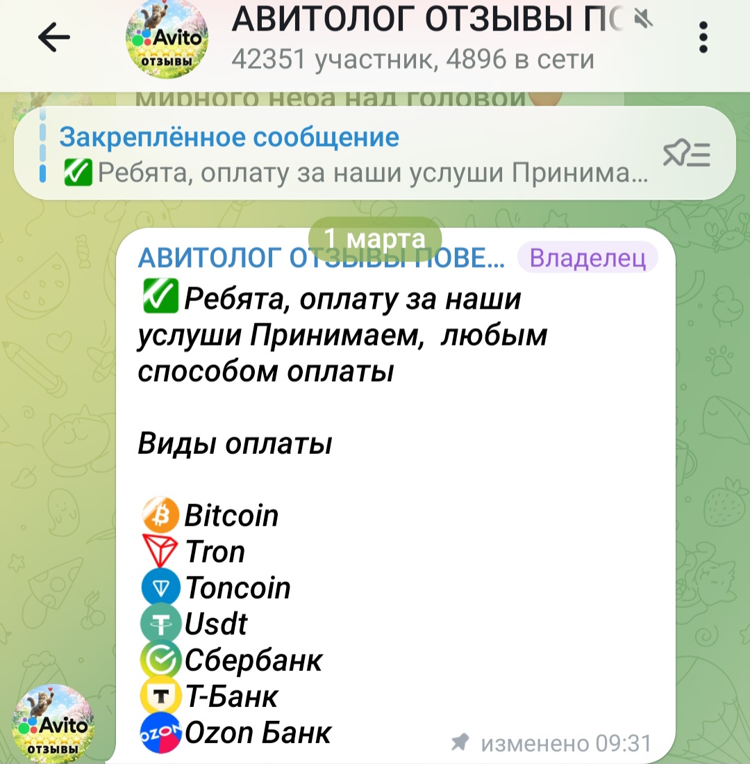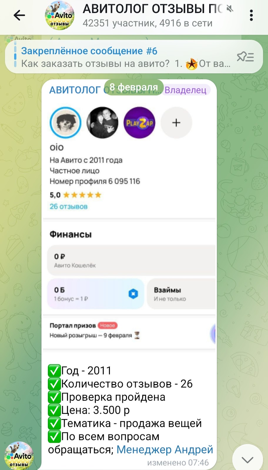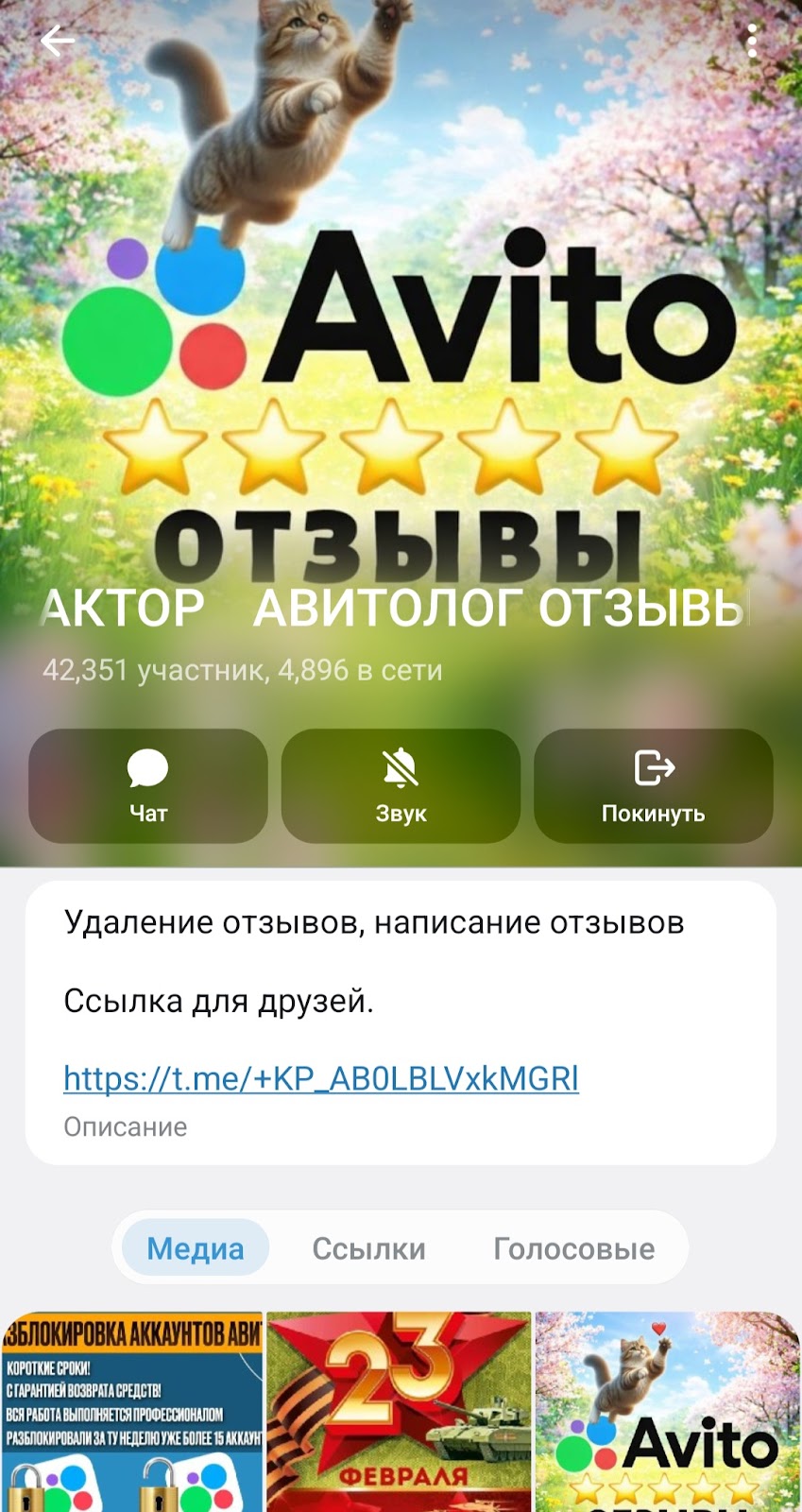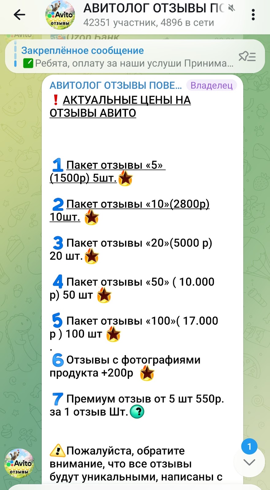 Через канал “Авитолог отзывы поведенческий фактор” предлагают написание и удаление отзывов, покупку раскрученных аккаунтов, накрутку подписчиков и другие услуги для повышения рейтинга и раскрутки профиля. Но прежде чем заказывать в нем услугу, учтите следующее:
