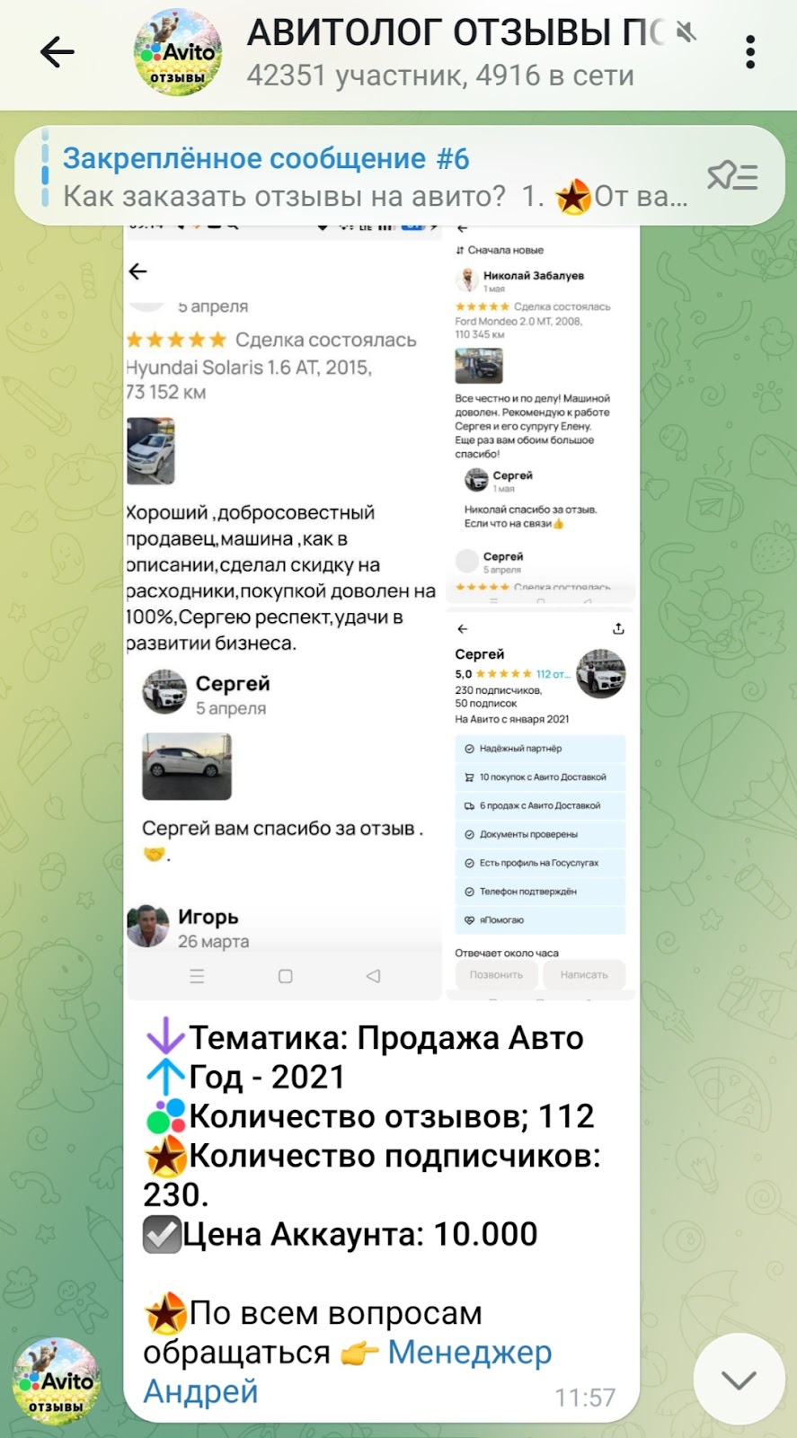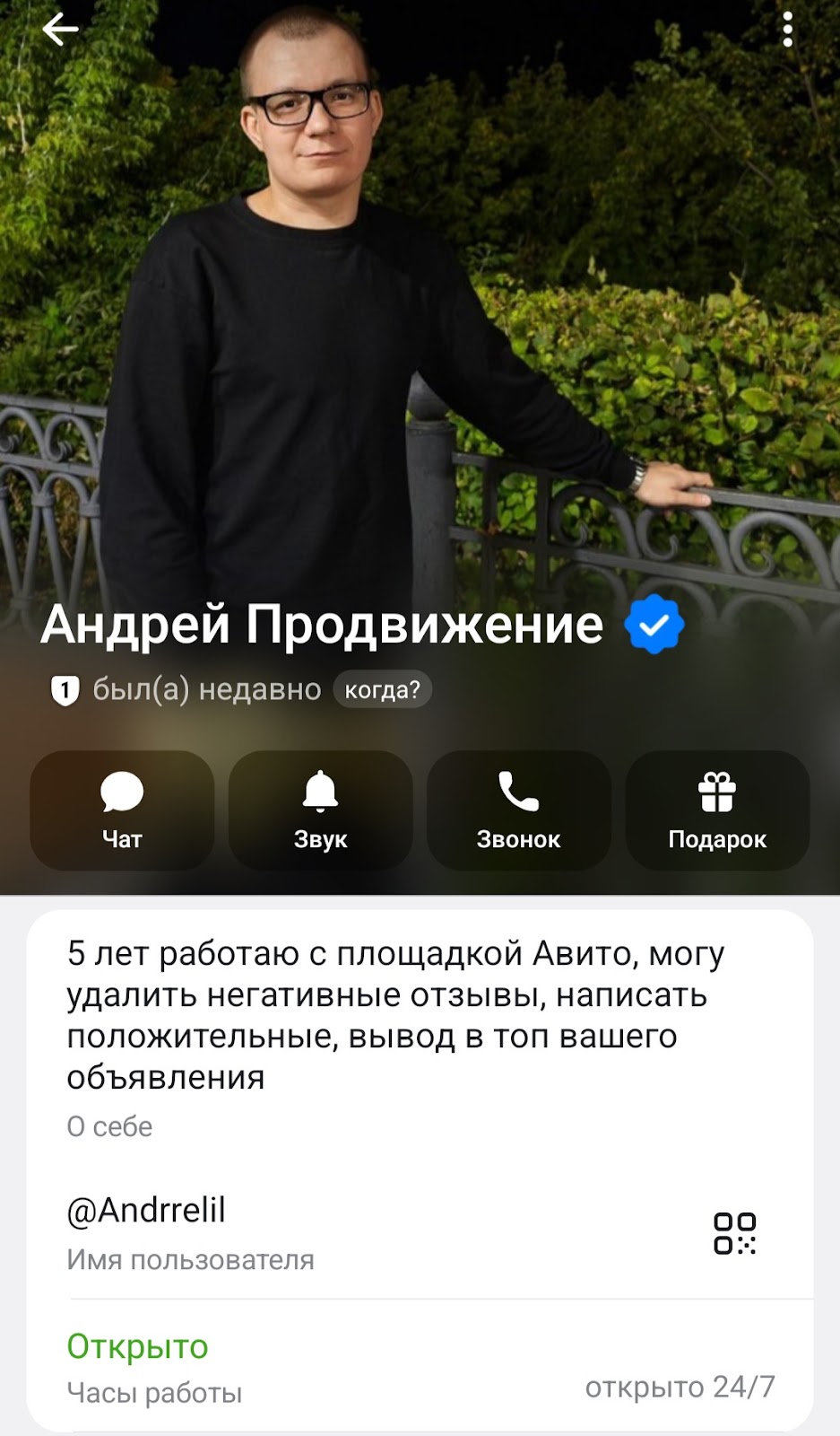 Менеджером канала “Авитолог отзывы поведенческий фактор” является некий Андрей. Он заявляет, что более 5 лет работает с площадкой Авито. Якобы может написать положительный отзыв за деньги или удалить негативный, вывести в топ объявление. При этом подтверждений своей экспертности не приводит, а результаты работы не публикует.