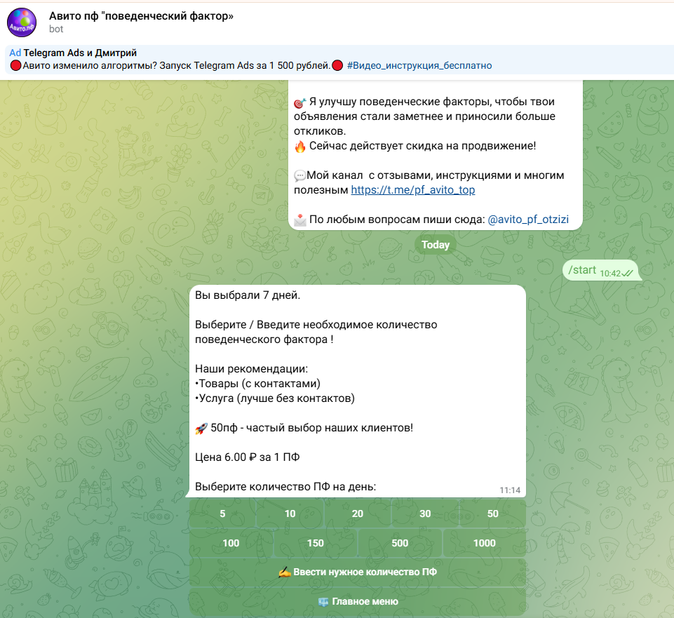 Телеграм-канал «ПФ АВИТО ПРОДВИЖЕНИЕ ПОВЕДЕНЧЕСКИЙ ФАКТОР AVITOPF bot» как раз занимается тем, что поднимает объявление на Авито в топ за копейки. Создатели проекта уверяют, что заходят в объявления с уникальных IP-адресов, с трастовыми уникальными куками в браузере, находят объявление по ключевым запросам, а затем совершают рандомные действия внутри карточки. К таковым относятся: добавление в избранное, запрос контакта, просмотр фото, отзывов и расположения продавца. Все это делается в хаотичном порядке, чтобы создать видимость посещения профиля реальным человеком.