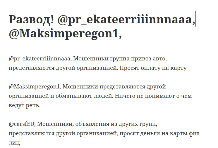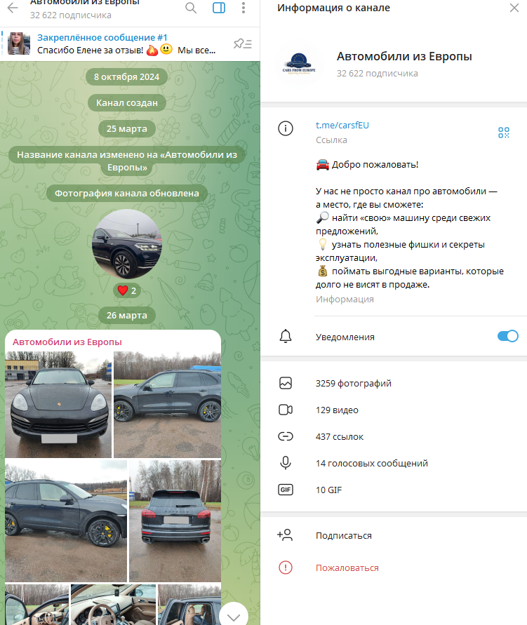 На Тг-канале carsfEU пользователям предлагаются услуги по пригону автомобилей из стран Европы. При этом регистрации нет, договоры не оформляются, а оплата принимается на карты различных пользователей.