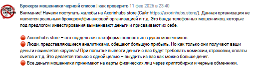 В соцсетях тоже похожая картина – есть свежие предупреждения о мошенничестве Axorinhubs, но комментарии пострадавших от их действий отсутствуют.