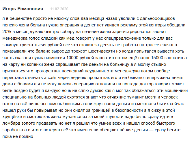 В сети нет проверенных откликов от инвесторов и трейдеров о герое нашего обзора. Мы нашли лишь один комментарий, но его автор описывает сомнительную ситуацию без доказательств в виде скриншотов платежных операций и т.п.