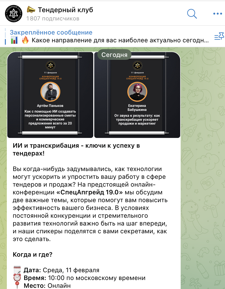 В июле 2020 года Евгений открыл канал в Телеграм «Тендерный клуб», на который за 6 лет подписалось 1800 человек. В нем автор объявляет о проведении онлайн-мероприятий, на которые приглашает разных спикеров. Среди них Георгий Сухадольский, Евгения Олимпиева и другие. Евгений указывает тематику конференции, время, место (чаще всего онлайн) и кратко описывает программу. В конце сообщения дает ссылку для записи на собрание.