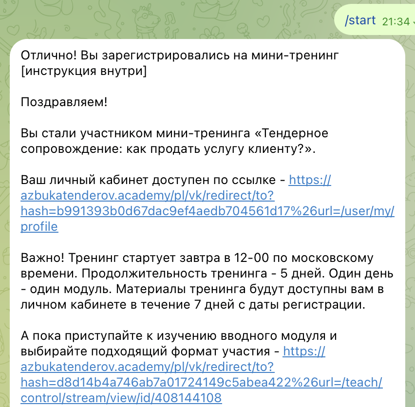 После запуска бот пишет, что клиенту удалось зарегистрироваться на платформе. Далее появляется ссылка на личный кабинет. В нем ученикам открывают доступ к мини-тренингу «Тендерное сопровождение», марафону «Специалист по тендерам», мини-тренингу «Мастер продаж через бесплатные консультации» и курс по подписке «Победитель тендеров».