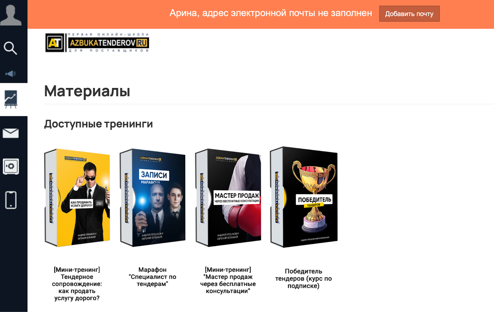 Для просмотра первых трех материалов нужно заполнить форму дополнительной авторизации: ввести имя, электронную почту и номер телефона. Как купить курс «Победитель тендеров» — неясно.