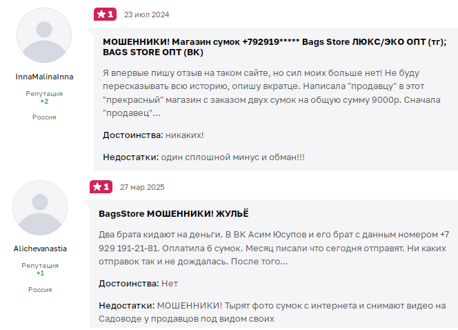 Аферистам нужно только, чтобы люди им отправили деньги на карту. После зачисления денег обманщики пытаются развести юзеров на новые перечисления, утверждая, что ТК требует оплатить непредвиденные сборы или придумывая другие причины для отправки денег покупателями. В конечном счете жертвы мошенников не получают ни заказанных вещей, ни средства назад вернуть не могут. Аферисты заносят жалующихся в ЧС. Поэтому мы призываем не контактировать с организаторами скам-магазина «Бэгс Ш».