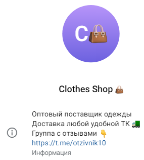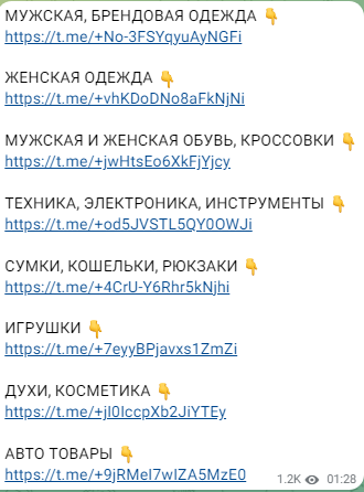 Группа представляет собой каталог со ссылками на телеграм-комьюнити узкой направленности. Организаторы сервиса предлагают юзерам посетить онлайн-шопы, специализирующиеся на продаже мужской и женской одежды, игрушек, сумок и кошельков, а также духов и кроссовок.
