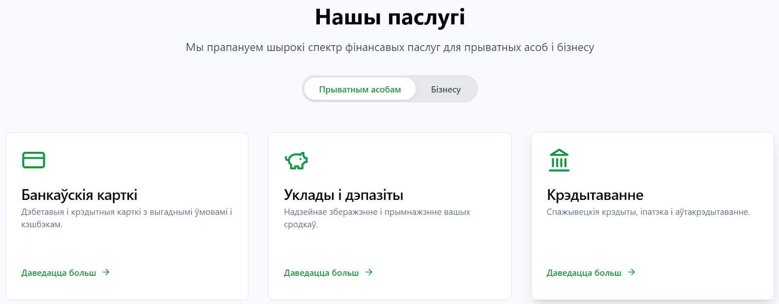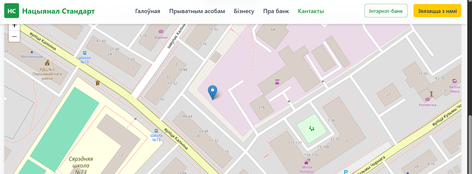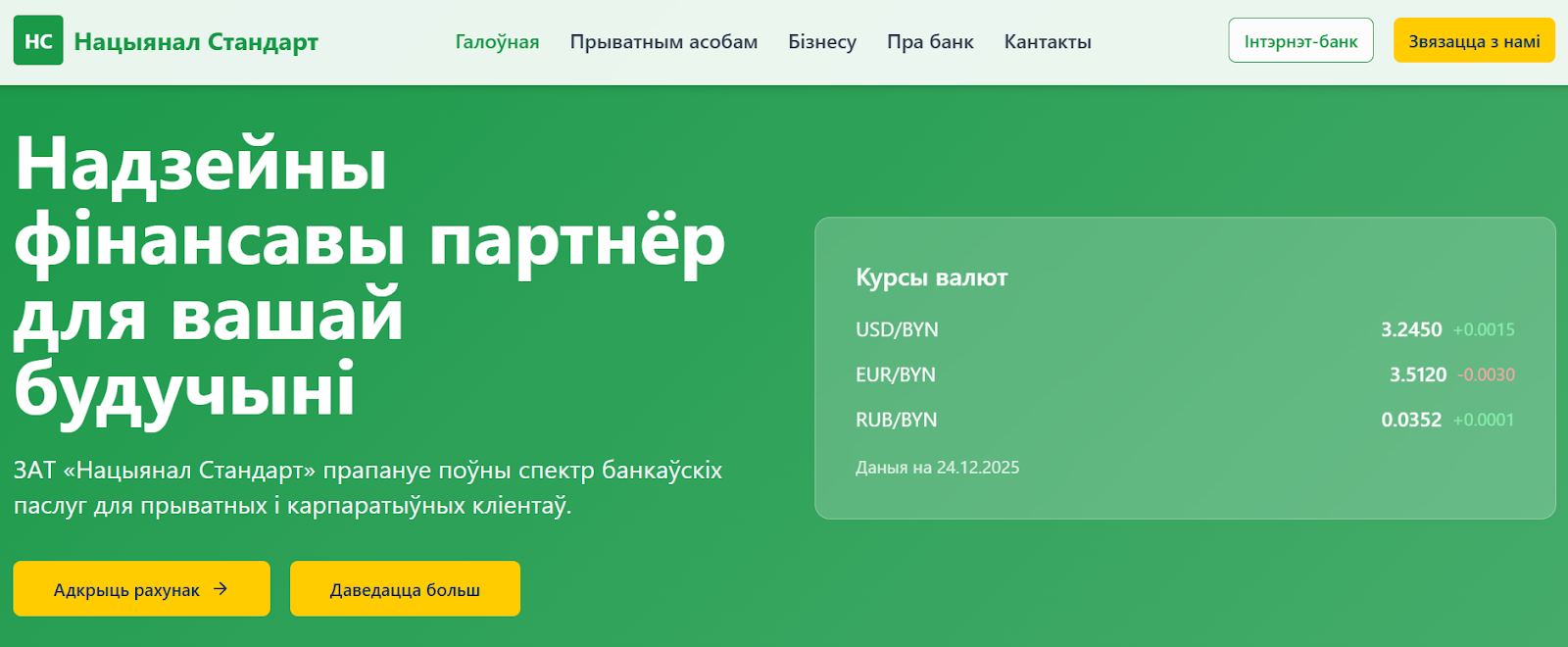 Платформа представляется как ЗАТ «Нацыянал Стандарт», где можно получить полный спектр банковских услуг для частных и корпоративных клиентов. Поэтому пользователи видят перед собой стандартный ресурс банка, который не внушает подозрений. Данная финансовая система предлагает открыть карты, среди которых есть дебетовая и кредитовая с различными выгодными условиями и кешбеком. Тут же можно делать вклады и открывать депозиты. Организация обещает надежное хранение и рост средств за счет дивидендов.