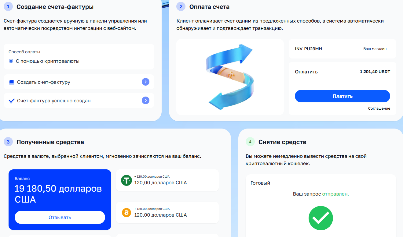 Схема простая. Создаете счет в личном кабинете или настраиваете автоматическую генерацию через интеграцию с сайтом. Клиент оплачивает заказ криптой. Система фиксирует перевод и зачисляет деньги на баланс. Дальше можно вывести средства на свой кошелек в любое время.