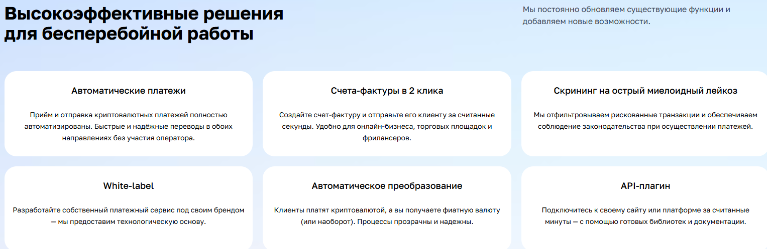 Из фишек – автоматическая конвертация в стейблкоины. Получили биткоин, а на счет упали USDT. Это защищает от скачков курса и позволяет не следить за рынком каждую минуту. Также сервис проверяет входящие платежи на чистоту по базам AML. Комиссии обещают от 0,3% для крупных клиентов. Но точные цифры обсуждаются персонально после подачи заявки.