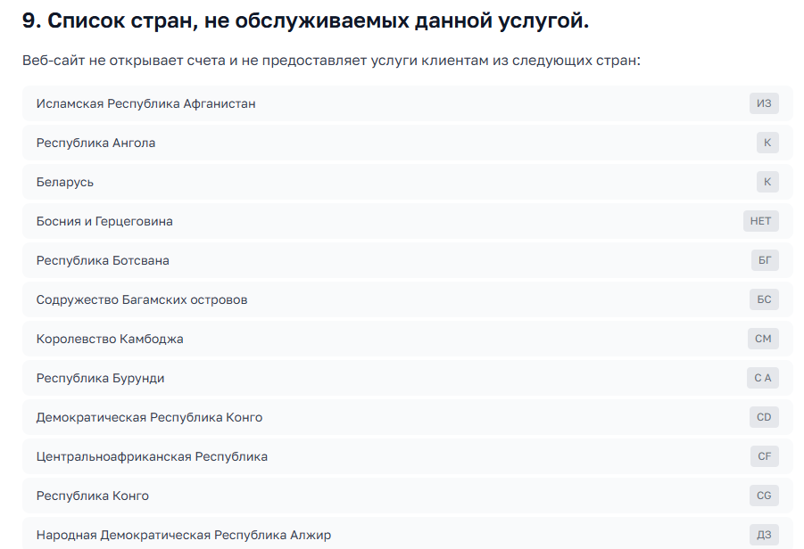 На сайте выложены правила использования и документ по борьбе с отмыванием денег. И вот что интересно – сервис официально не работает с жителями России, Украины, Беларуси и еще нескольких десятков стран. Список ограничений внушительный и включает большую часть СНГ.