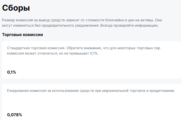 Стандартная комиссия – 0,1% для большинства пар. За маржу берут 0,078% в день. Это стандартные ставки рынка. Минимальный депозит не указан. Комиссии за вывод разные: BTC – 0,0005, ETH – 0,005, USDT – 50, DOGE – 50. За снятие наличных с карты – 2,8%.