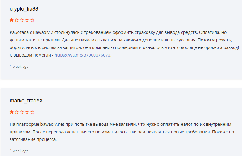 Клиенты в отзывах о BawaDiv в сети описывают одну и ту же схему: при попытке вывода средств клиентам выставляют дополнительные требования – оплатить страховку или налог. После перевода денег появляются новые условия, и деньги остаются заблокированными на аккаунте, а убыток только растет.