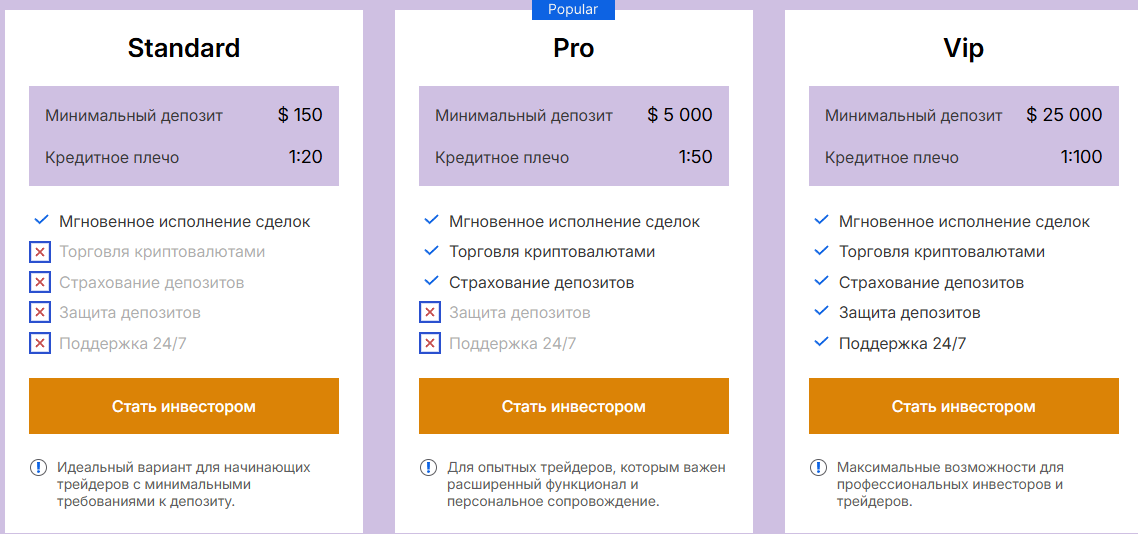 - Pro – минимальный депозит $5,000, кредитное плечо 1:50, доступна торговля криптовалютами и страхование депозитов;
