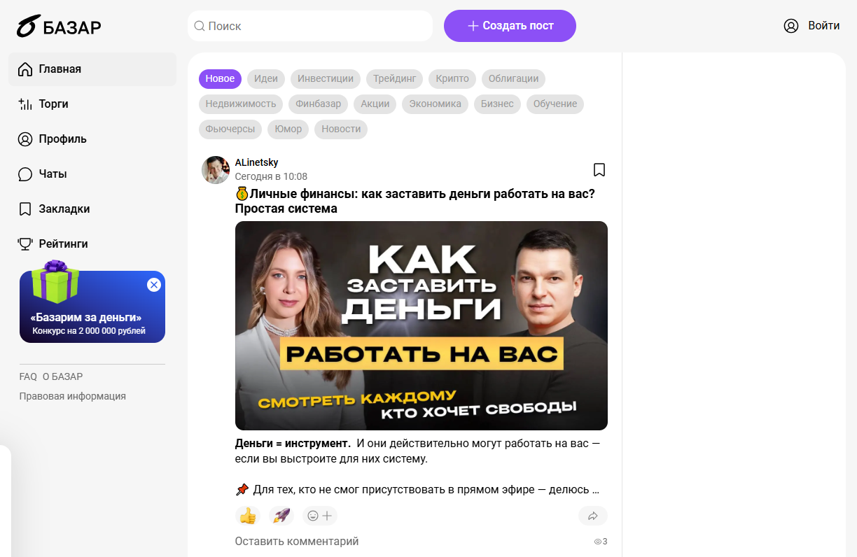 Создатели проекта «Базар» позиционируют его как новую социальную сеть про финансы. Это платформа для трейдеров и инвесторов, на которой они не только могут общаться между собой в личных чатах, но и добавлять публичные посты, а также зарабатывать на этом. В обзоре нашей редакции мы выясним, какие еще функции доступны на Fin Bazar и стоит ли регистрироваться на этом сайте.