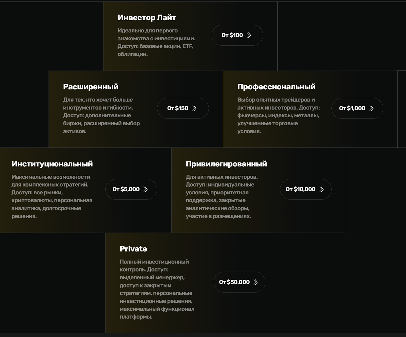 - Привилегированный. Универсальный тариф с возможностью вложений от 10 000 USD и более. Из плюсов выделяются аналитические обзоры, приоритетная поддержка, участие в листинге и т. д.