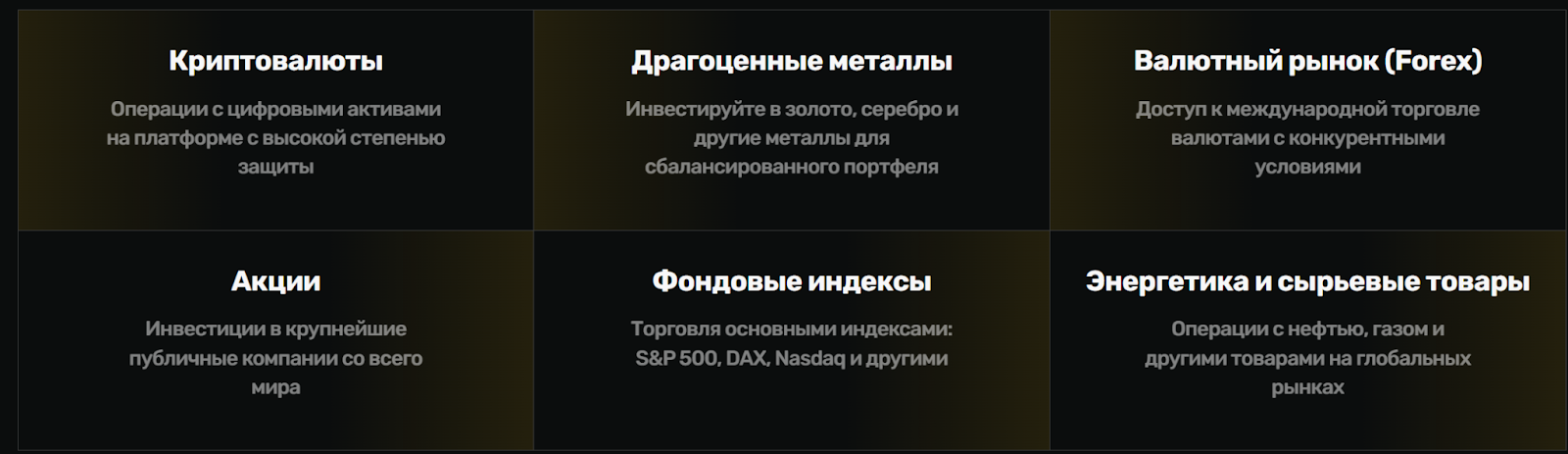 - энергетические и сырьевые товары — дают возможность зарабатывать на сделках с газом, нефтью и другими товарами;