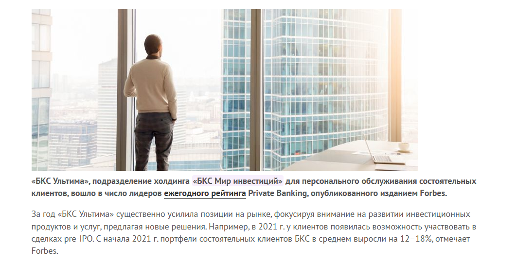 Private Banking подразумевает персональное обслуживание с индивидуальными стратегиями от якобы опытных специалистов БКС, однако в интернете подобные услуги нередко получают негативные отзывы из-за непонятных экспертов. Хоть на сайте и обещают увеличенный доход, официальной статистики нет, а нам удалось найти лишь информацию о росте портфелей на 12-18% за 2025 год.