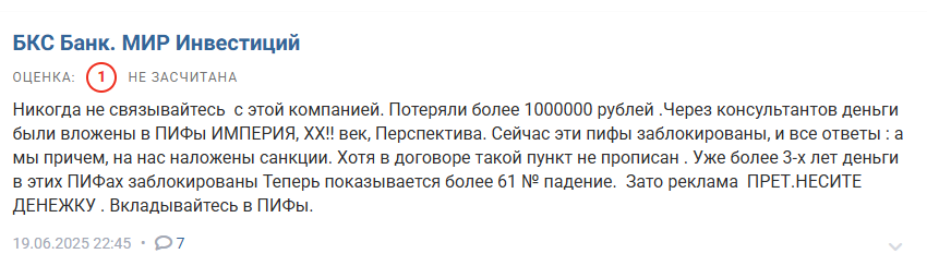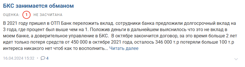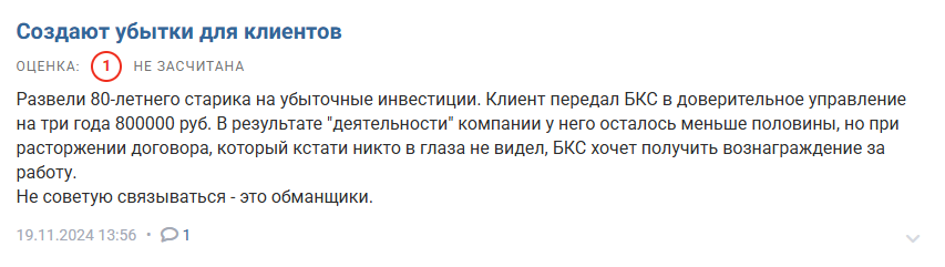 Несмотря на это обычные услуги от компании ООО Бкс получают крайне негативные отзывы. Клиенты призывают не пользоваться доверительным управлением, потому что вернуть деньги обратно якобы невозможно. Вместо квалифицированных специалистов там сидят якобы инвесторы без навыков в торговле, которые просто обманывают людей. По истечении договора у многих депозит становится в несколько раз меньше изначального, а команда дополнительно требует выплаты за “проделанную работу”.