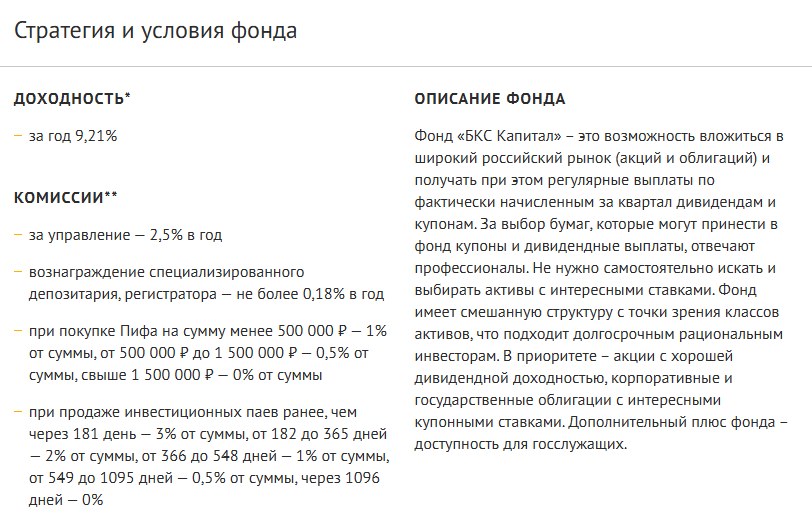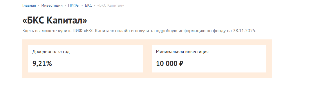В рамках бизнес группы БКС существует так называемый открытый паевой инвестиционный фонд (ОПИФ), который известен как БКС Капитал. Его преимущество заключается в том, что все выплаты по дивидендам / купонам могут поступать сразу на брокерский счет. Основная сфера инвестирования это акции и облигации российских компаний в рублях. Также учитывайте, что он был зарегистрирован лишь в 2023 году.