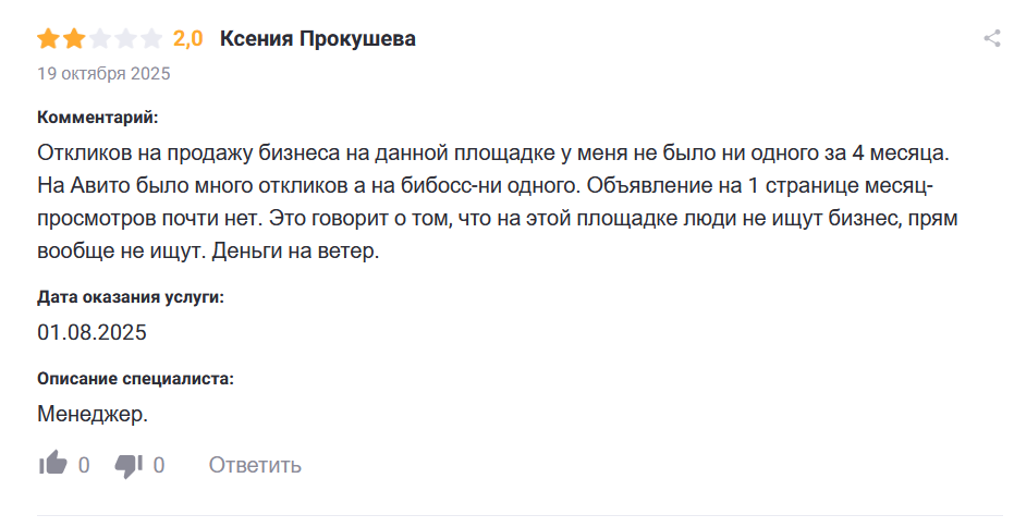 Комментарии о проекте при изучении легко разделяются на две условные группы. В первой очень лестные отклики о работе портала. Во второй, наоборот, сообщения отражают крайнюю степень недовольства. Нейтральных не встречается. Примеры положительных отзывов о «Бибосс» легко найти на самом сайте. В них говорится о том, что сотрудничество с проектом помогает с поиском деловых партнеров, продажей франшиз, готового бизнеса и т. п.
