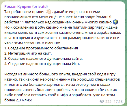 Автор заявляет, что якобы работал с разнообразными онлайн-казино, создавал ПО. Но как утверждает автор, многие из владельцев ему не платили, за счет чего он специально создавал программы с уязвимостями. Выглядят такие истории откровенно неправдоподобно. Кроме того, маловероятно, что Роман был единственным программистом в целом штате специалистов.