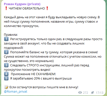 Пользователям Роман предлагает схемы по взлому этих платформ. Как утверждает сам автор, он якобы работает за процент от дохода:
