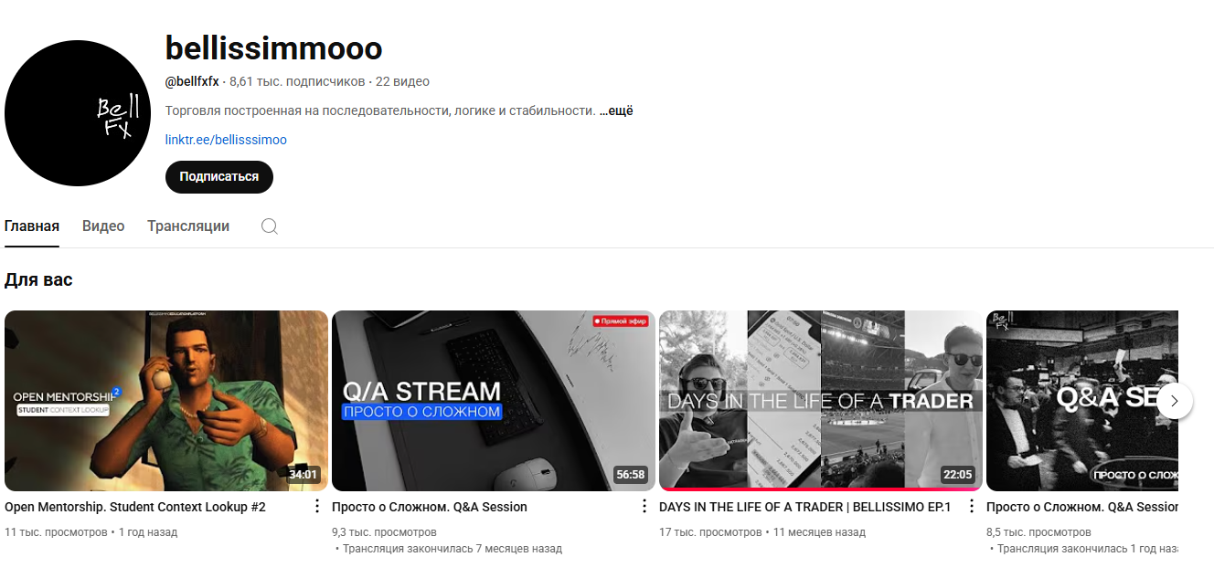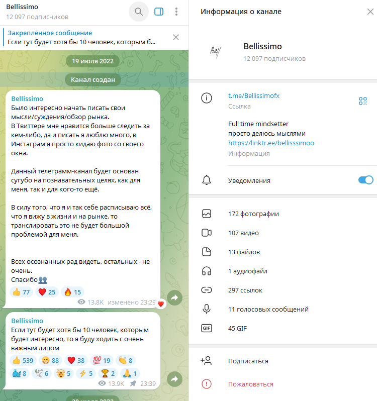 Автор активно ведет социальные сети – блоги на Ютуб и в Телеграм. Тг bellissimofx был зарегистрирован летом 2022 года. За все время работы на канал подписалось более 12 тысяч пользователей. Активность есть, некоторые посты собирают даже большее число подписчиков, чем в целом подписано на сообщество.