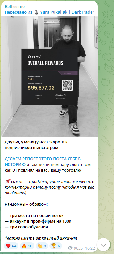 При этом работа платформы направлена на продвижение проп-трейдинга. Лучшим ученикам предлагаются проп-аккаунты. Судя по всему, трейдер Bellissimo с командой работает именно с брокером FTMO.