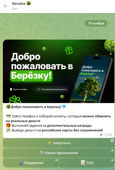 Berezka app bot: трясешь телефон, растишь виртуальную березку, а в итоге – скам. Разработчики ушли в лес с деньгами.
