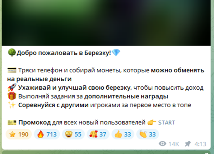 Очередной скам-проект, где анонимные разработчики обещают золотые горы за тряску телефона и выращивание виртуальной березки. Обещают вывод на карту, но как именно — неизвестно. Техподдержка не отвечает, канал заморожен. Похоже, создатели просто скрылись с деньгами доверчивых пользователей.