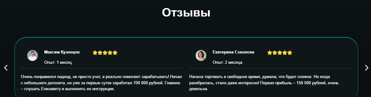 Но это не значит, что Елизавета поможет вам раскрутить счет до огромных сумм. Потому что она дает пустые гарантии возврата, ничем не подкрепленные. К тому же небольшой минимальный депозит служит лишь приманкой, судя по откликам на независимых сайтах ее клиентов. В общем, никаких плюсов мы не нашли.