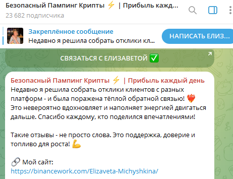 Мы изучили Безопасный Пампинг Крипты – Telegram проект трейдерши Елизаветы. Она убеждает, что зарабатывать на пампинге монет безумно выгодно. Безусловно, такой бизнес на крипте существует и она “не изобрела велосипед”. Однако, если делать это с умом. И, конечно же, суммы будут небольшими. Также есть достойные трейдеры, которые предлагают помощь.