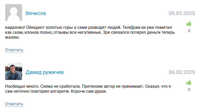 Отзывы о Big Money подтверждают, что предложенные схемы являются фейком. Десятки пользователей пишут, что они проиграли депозит из-за инструкций автора.