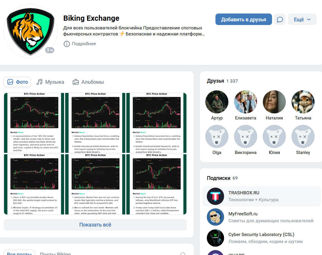 BiKing Exchange вызывает серьезные сомнения. Сайт выглядит небрежно, как будто его делал школьник, что недопустимо для серьезной компании. Информация о создателях отсутствует, вкладка «О нас» не открывается, а юридический адрес и реквизиты не указаны. Заявления о работе в 26 странах и 1,2 миллиона пользователей кажутся выдуманными, учитывая отсутствие филиалов и лицензий. ВКонтакте у них 1,3 тысячи друзей, но большинство аккаунтов удалены, что указывает на накрутку. Отзывы практически отсутствуют, а единственный найденный — негативный, с жалобой на заморозку аккаунта без причины. Сотрудничество с BiKing Exchange — прямой путь к потере средств.