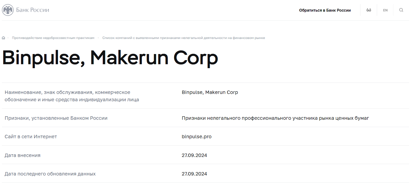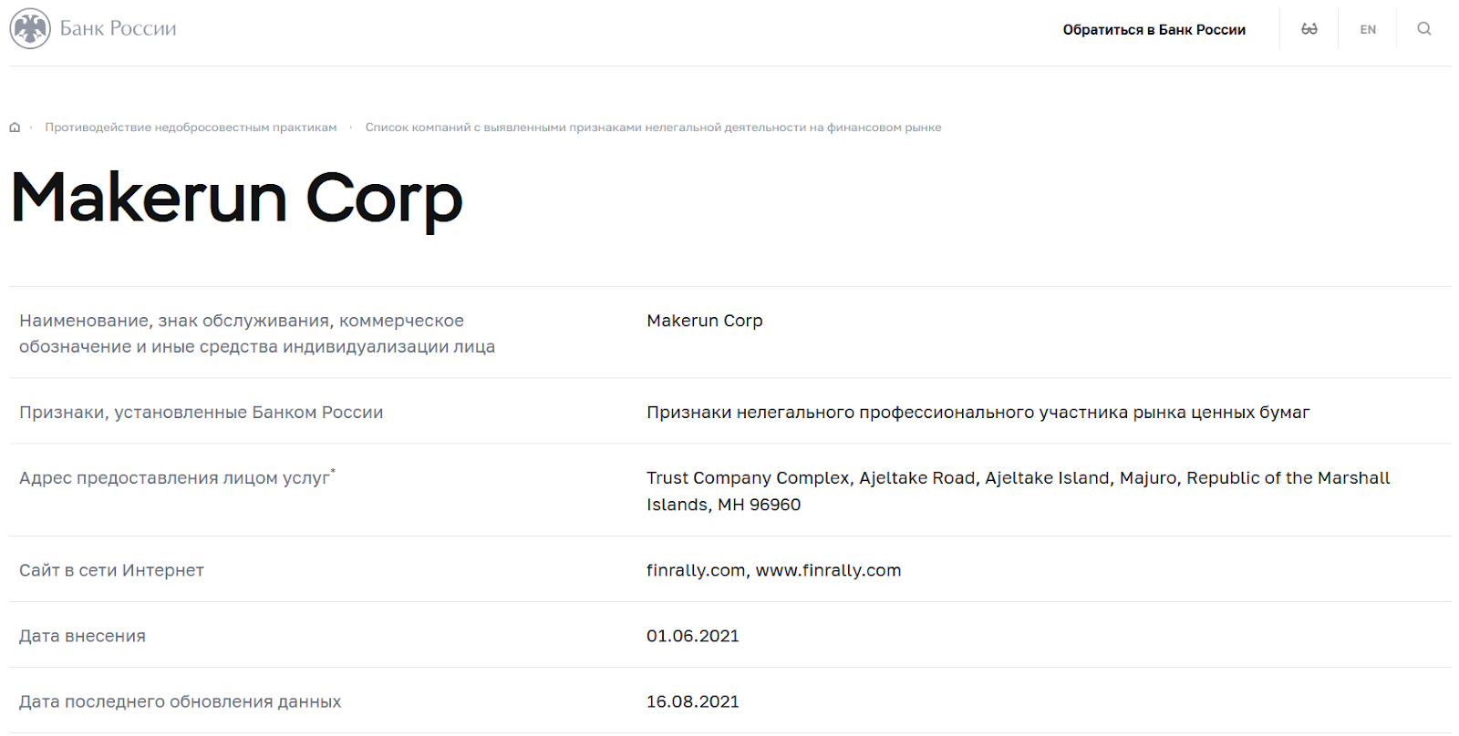 - Makerun Corp, указанная в контактах на сайте, числится в реестре нелегальных у Центрального банка РФ;