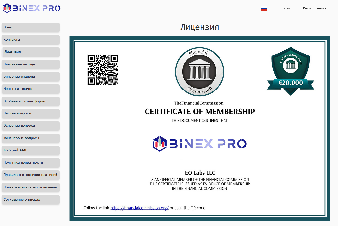 На отдельной странице создатели Binexpro презентуют лицензию от регулятора Financial Commission в виде скана сертификата. Ссылка на официальный реестр отсутствует, а на самом документа указана компания EO Labs LLC, а не упоминаемая в соглашении. На сайте самого регулятора упоминаний Бинекс не нашлось.