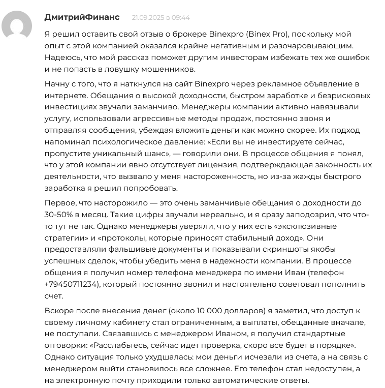 Binexpro – очередной обман, на который я, к сожалению, попался. Обещали стабильный доход, а в итоге – потеря всех вложений. Сайт выглядит профессионально, но это лишь ширма для выманивания денег. Поддержка сначала активно общается, но как только дело доходит до вывода средств, они исчезают. Не повторяйте моих ошибок, держитесь подальше от этих мошенников.