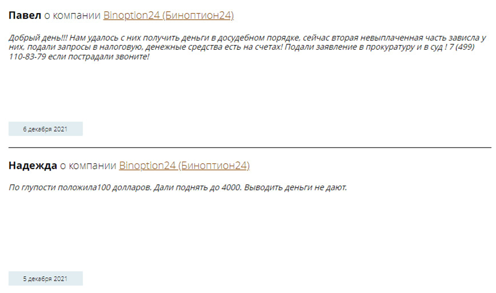 Отзывов удалось найти не много, но все они негативные. Пользователи рассказывают, что вывод средств заблокировали. У какого-то инвестора получилось вернуть часть денег, но при судебных разбирательствах. Возможно, именно из-за этого площадку Binoption24 удалили.