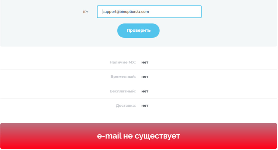 В качестве службы поддержки был указан адрес электронной почты support binoption24 com. Проверка показала, что его не существует. Другие контактные данные не предоставлялись.