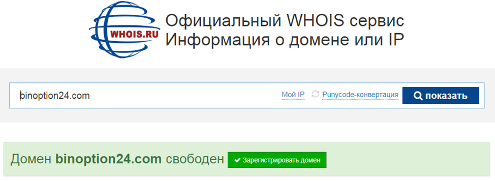 Когда зарегистрирован брокер Binoption24 – неизвестно. Проверка доменного адреса показала, что он является свободным. Это доказывает то, что домен либо продали, либо просто удалили.